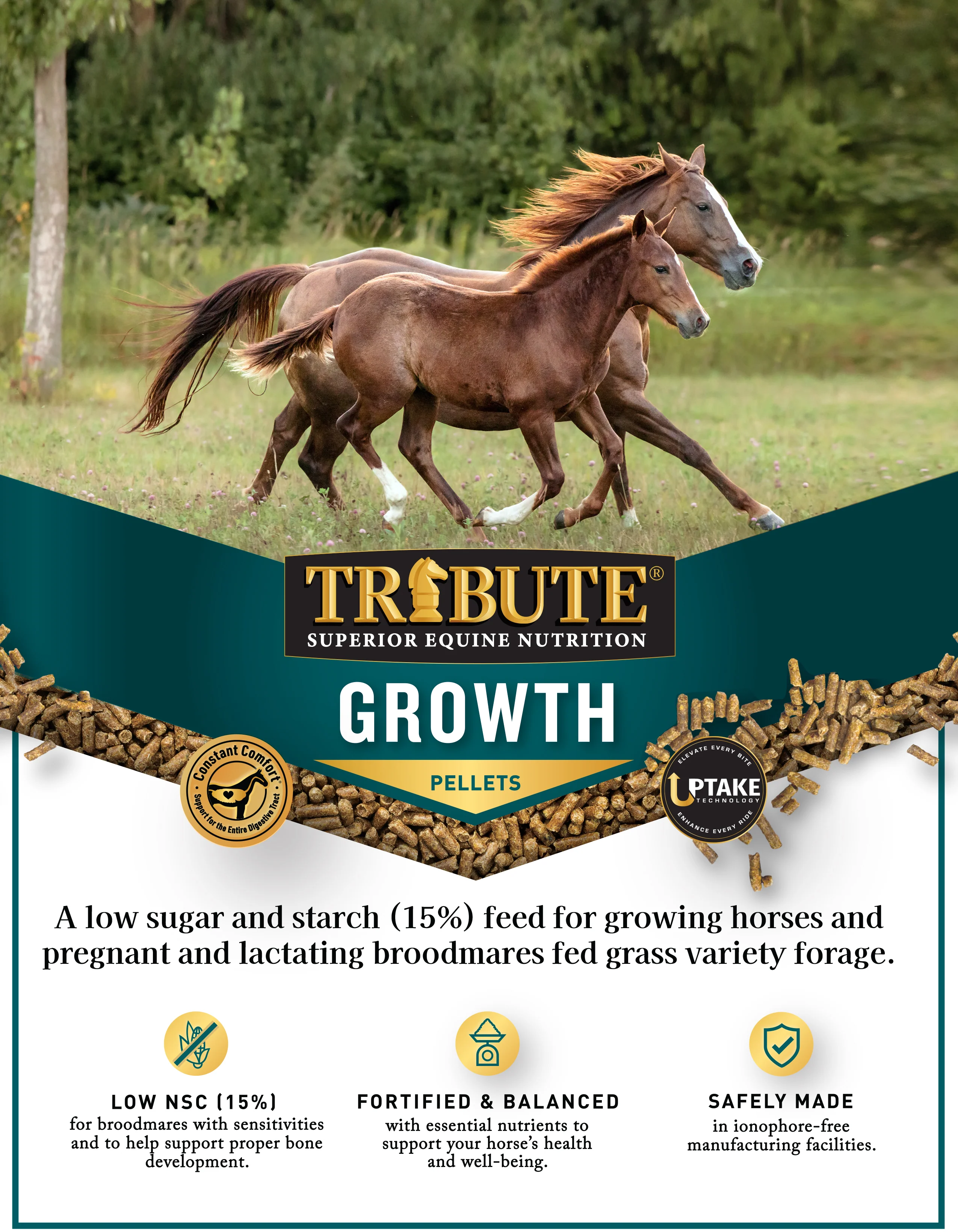 Growth Pellet is a low NSC, pelleted horse feed designed for growing horses and pregnant and lactating mares consuming grass variety forages. This feed is formulated with Uptake Technology™, a powerful blend of ingredients that improve nutrient absorption, and Constant Comfort®, a premium seaweed derived calcium that supports gastric pH and optimal bone and tissue development. Learn more here!
