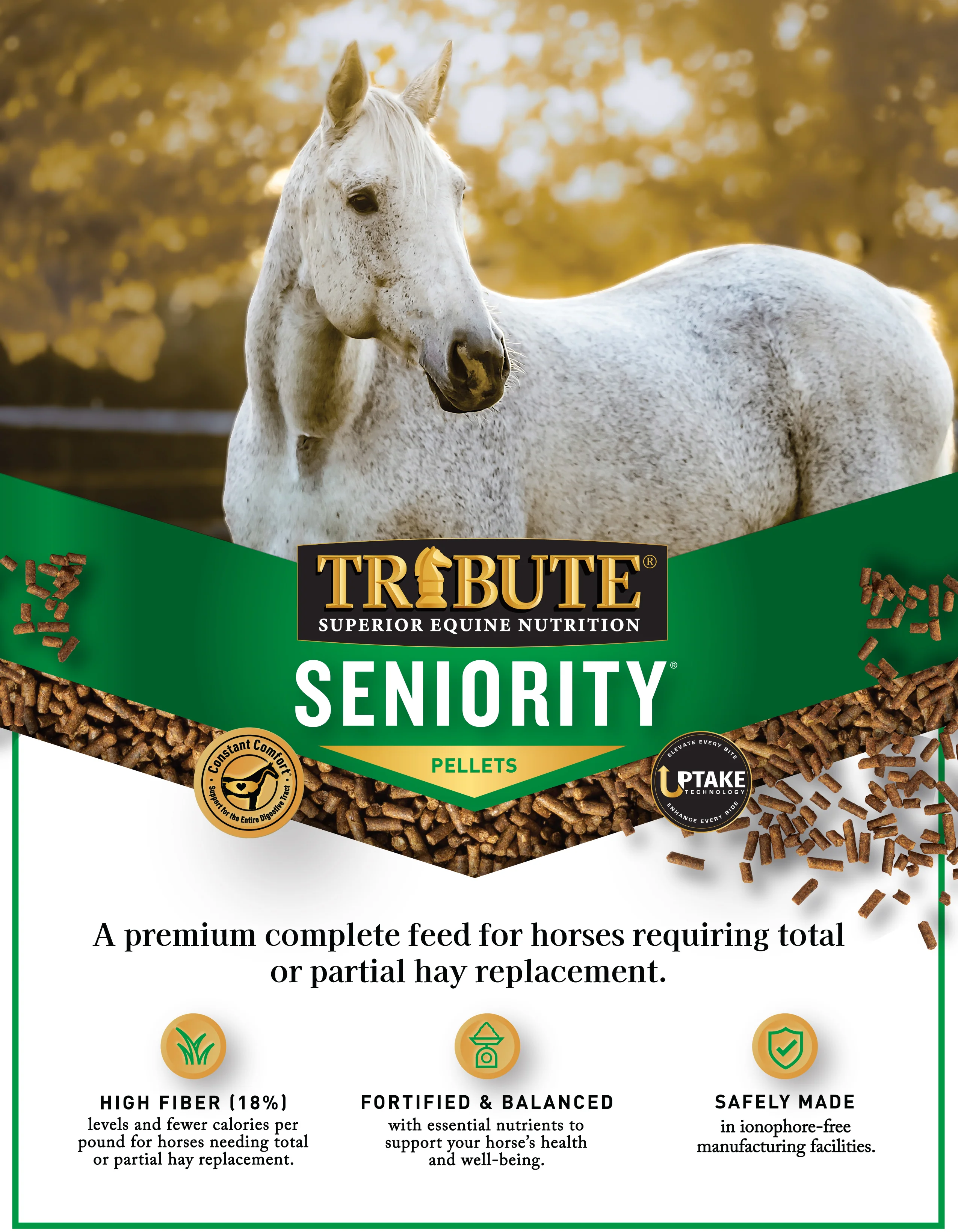 Seniority® is a premium, complete horse feed designed for horses that require total or partial hay replacement. This feed is formulated with Uptake Technology™, a powerful blend of ingredients that improve nutrient absorption, and Constant Comfort®, a premium seaweed derived calcium to support gastric pH. Learn more here!